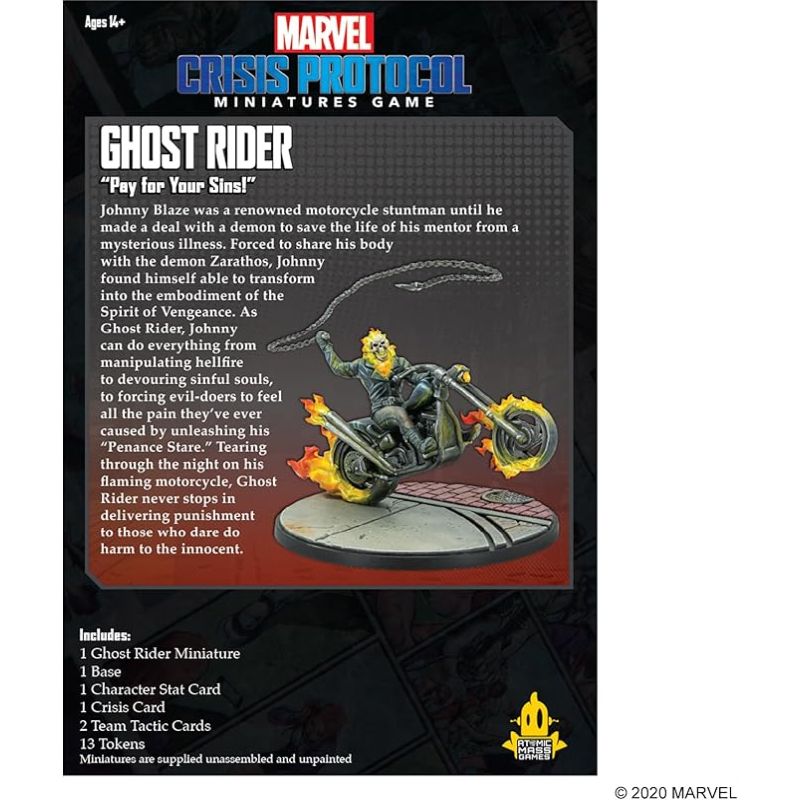 Johnny Blaze era un renombrado acróbata de motocicletas hasta que hizo un pacto con un demonio para salvar a su mentor de una misteriosa enfermedad. Obligado a compartir su cuerpo con el demonio Zarathos, Johnny descubrió que podía transformarse en la encarnación del Espíritu de la Venganza. Como Ghost Rider, Johnny puede hacer de todo: desde manipular el fuego infernal hasta devorar almas pecadoras, e incluso hacer que los malhechores sientan todo el dolor que han causado con su “Mirada de Penitencia”. Recorriendo la noche a toda velocidad en su motocicleta en llamas, Ghost Rider no ceja en su empeño de castigar a quienes se atreven a dañar a los inocentes.
